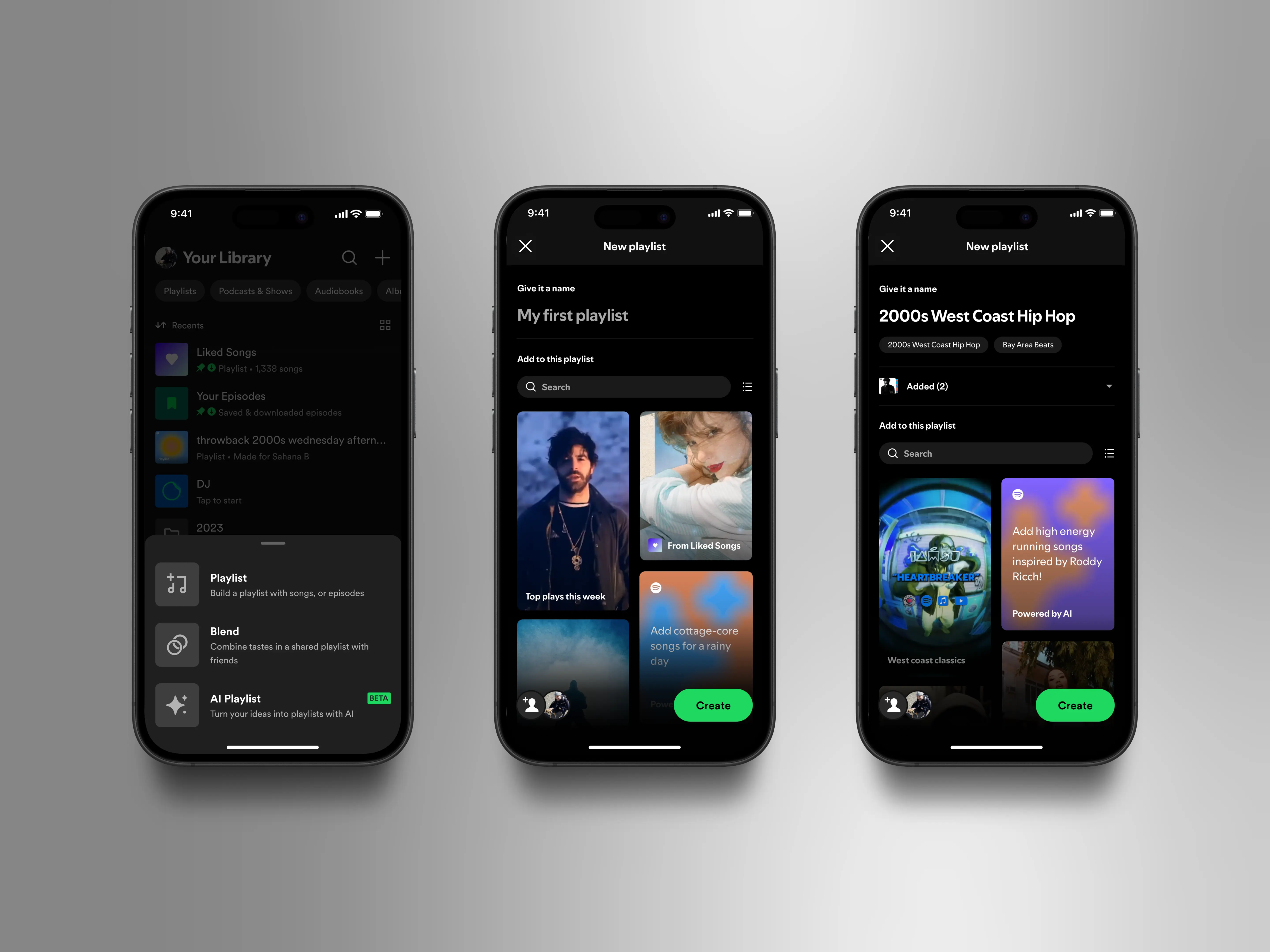 The previous creation flow emphasized naming before curation. After naming, listeners landed in an empty playlist—an uninspiring dead end that halted momentum and often prevented curation from happening at all. Our aim in this project was to encourage listeners to create more meaningful playlists that they continue to invest in and engage with over time.